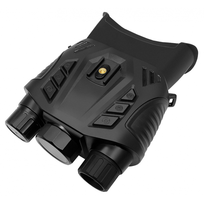 Для формирования изображения окружающего мира прибор использует современный CMOS-сенсор. Далее картинка выводится на жидкокристаллический IPS-экран с разрешением 640х360 пикс, где дополнительно увеличивается при помощи выпуклой линзы – это позволяет визуально воспринимать изображение как на 5-дюймовом дисплее, хотя реальная диагональ равна 2,4 дюймам, а также улучшает качество и детализацию картинки. Работа с биноклем в ночное время осуществляется за счет встроенной ИК-подсветки с длиной волны 850 нм и мощностью 3 Вт – этого достаточно для обнаружения объектов в полной темноте на расстоянии 250–300 метров. Точку, создаваемую осветителем с длиной волны 850 нм могут заметить дикие животные или сторонние ПНВ, – учитывайте это, если вам важно сохранить свое положение на местности в тайне. Пользователю доступна настройка яркости ИК-подсветки – можно выбрать один из 7 уровней. Также можно настроить яркость самого экрана – для него предусмотрено 8 уровней интенсивности.
